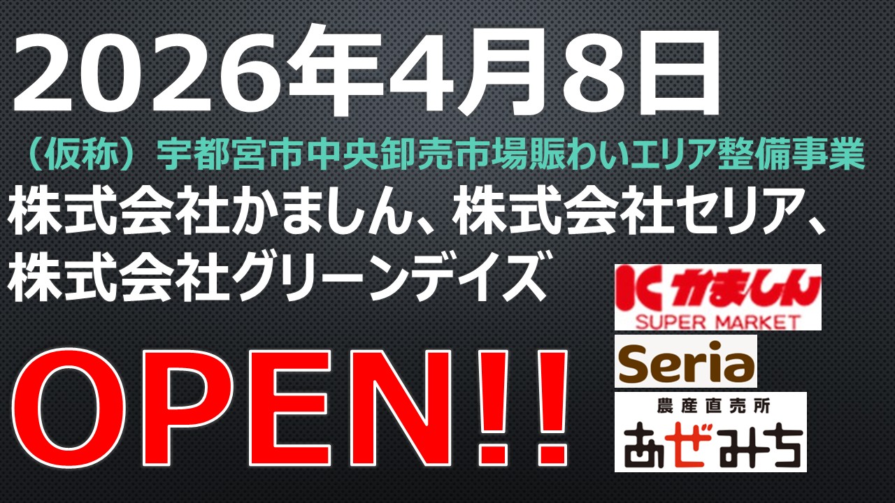 OPEN!【2026年4月8日】(仮称)宇都宮市中央卸売市場賑わいエリア整備事業 スポンサーリンク X Facebook はてブ LINE コピー 2025.10.15 スポンサーリンク OPEN!【2026年4月8日】(仮称)宇都宮市中央卸売市場賑わいエリア整備事業 新店予定日:2026年4月8日 住所:栃木県宇都宮市簗瀬町1493番地 企業名:株式会社かましん、株式会社セリア、株式会社グリーンデイズ 店舗名:(仮称)宇都宮市中央卸売市場賑わいエリア整備事業 営業時間:開店時間:午前9時00分、閉店時間:午後10時00分 店舗面積:5,886㎡ 駐車場:303台 駐輪場:121台 公式サイト:株式会社かましん、株式会社セリア、株式会社グリーンデイズ 公告:(仮称)宇都宮市中央卸売市場賑わいエリア整備事業