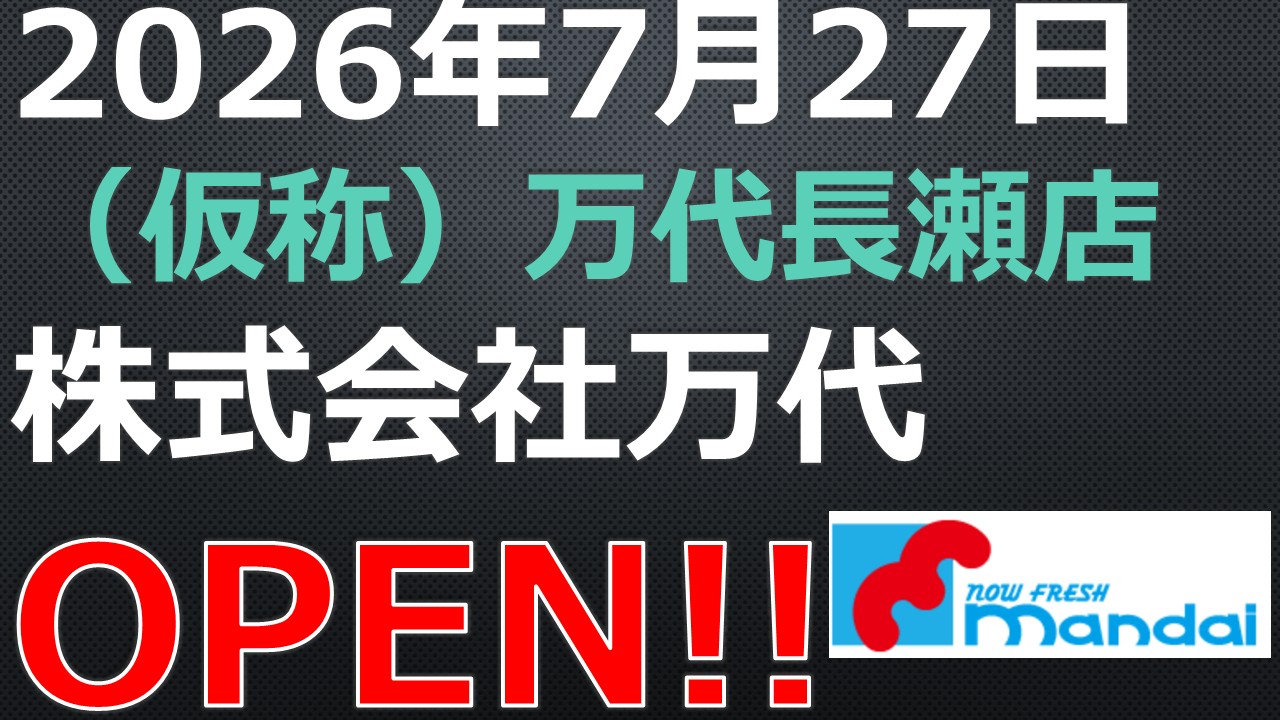 OPEN!【2026年7月27日】(仮称)万代長瀬店スポンサーリンク X Facebook はてブ LINE コピー 2026.01.19スポンサーリンク OPEN!【2026年7月27日】(仮称)万代長瀬店新店予定日:2026年7月27日住所:大阪府東大阪市長瀬町三丁目575番1ほか 企業名:株式会社万代店舗名:(仮称)万代長瀬店営業時間:開店時間:午前9時00分、閉店時間:午前0時00分店舗面積:1,377㎡駐車場:54台駐輪場:137台公式サイト:株式会社万代公告:(仮称)万代長瀬店