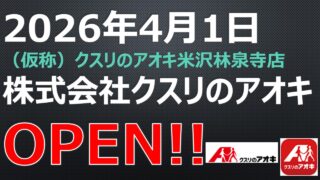 ドラッグストア OPEN!【2026年4月1日】(仮称)クスリのアオキ米沢林泉寺店 この記事は、山形県米沢市林泉寺二丁目2264番1外に2026年4月1日OPEN予定の(仮称)クスリのアオキ米沢林泉寺店について書かれています。 2025.09.29 ドラッグストア
