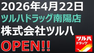 ドラッグストア OPEN!【2026年4月22日】ツルハドラッグ南陽店 この記事は、山形県南陽市宮内字八幡田591番地1外に2026年4月22日OPEN予定のツルハドラッグ南陽店について書かれています。 2025.10.21 ドラッグストア