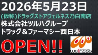 ドラッグストア OPEN!【2026年5月23日】(仮称)ドラッグストアウェルネス乃白南店 この記事は、島根県松江市2街区2‐1外に2026年5月23日OPEN予定の(仮称)ドラッグストアウェルネス乃白南店について書かれています。 2025.10.17 ドラッグストア